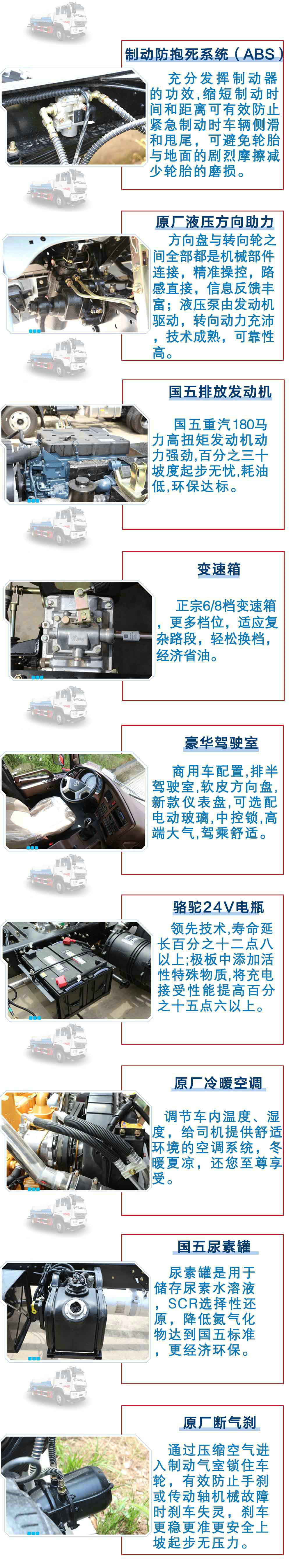 底盤配置:采用重汽斯太爾原裝底盤,白色前翻駕駛室,排半駕駛室,軸距4500mm,正宗國五重汽180馬力發(fā)動機,東風6檔變速箱,9.00-20輪胎,動轉(zhuǎn),排氣制動,原裝ABS防抱死系統(tǒng)。
