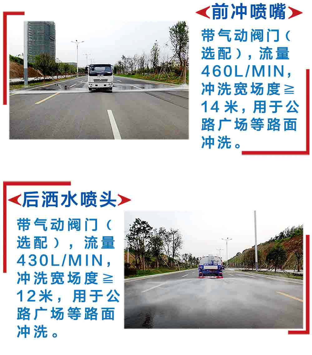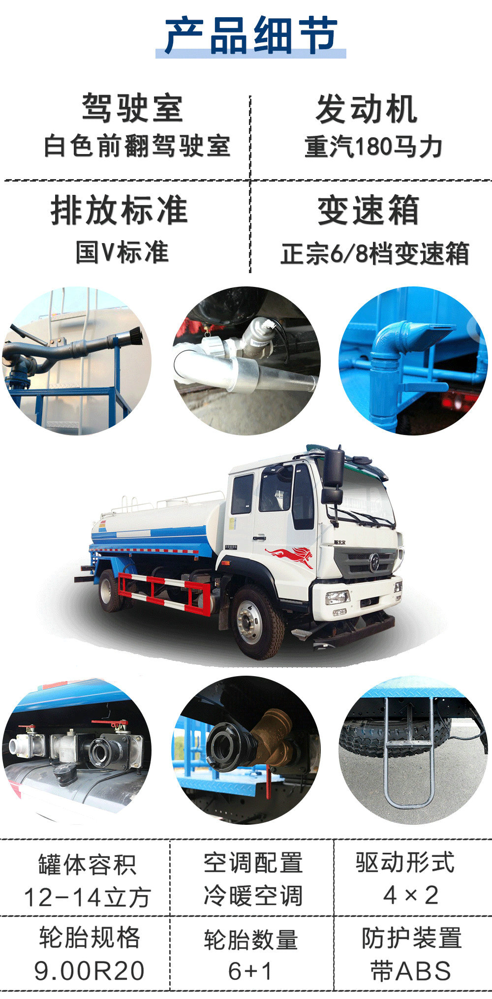 上裝配置:罐體采用4mmQ235優(yōu)質(zhì)碳鋼板制作,容積12立方,前沖(噴)后灑,帶側(cè)噴,罐體后帶工作平臺,平臺上安裝綠化灑水炮,灑水炮可全方位旋轉(zhuǎn),可連續(xù)調(diào)成直沖狀、大雨、小雨、毛毛雨,帶安全護欄,配備全國質(zhì)量評比第一名的億豐大功率專用灑水泵,泵可自吸自排,安裝過濾網(wǎng),帶消防接口,可通過消防栓進水,帶自流閥,罐體金屬漆。