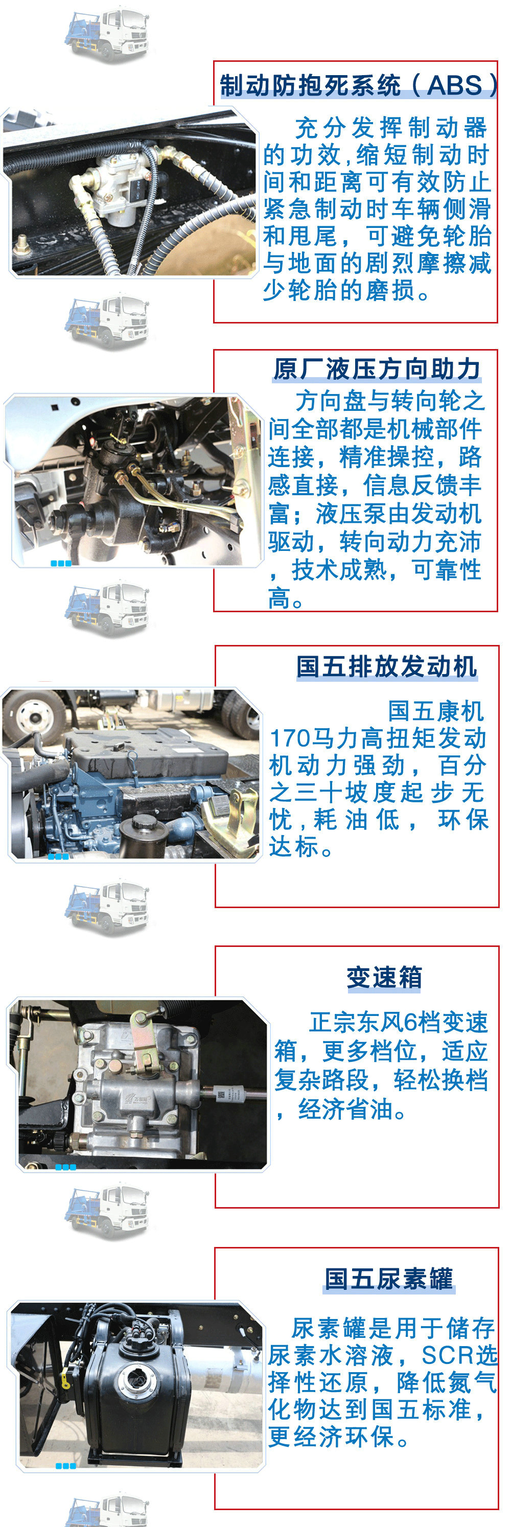 其他 | 1,隨底盤(pán)選裝駕駛室。2,該車(chē)整車(chē)長(zhǎng)/前懸/軸距對(duì)應(yīng)關(guān)系為(mm):8110/1440/4500,7920/1250/4500,7560/1440/3950,7370/1250/3950 。3,防護(hù)材料:Q235A碳鋼,連接方式:左右側(cè)面防護(hù)與底板采用焊接連接,后下部防護(hù)與車(chē)架采用焊接連接,后部防斷面尺寸(mm):100×50,后部防護(hù)離地高度(mm):425。4,ABS型號(hào)為ABS-E 4S/4M,生產(chǎn)企業(yè)是威伯科汽車(chē)控制系統(tǒng)(中國(guó))有限公司;該車(chē)安裝帶衛(wèi)星定位功能的行駛記錄儀。5,發(fā)動(dòng)機(jī)與油耗值對(duì)應(yīng)關(guān)系(L/100km):ISD180 50/26.8, YC6JA180-50/27.1,EQH180-52/26.2,ISB210 50/26.5,ISD190 50/26.0,YC4E160-56/25.8,YC4S150-50/25.7。6,車(chē)輛顏色,字體噴涂和局部細(xì)節(jié)可變化。7、專(zhuān)用裝置:擺臂機(jī)構(gòu),主要用于城鎮(zhèn)環(huán)衛(wèi)散裝生活垃圾的收集與運(yùn)輸。 |