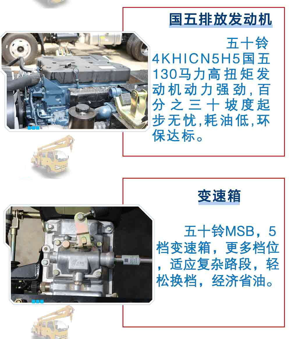 專用配置:五十鈴高空作業(yè)車作業(yè)高度為16米,液壓360度全回轉(zhuǎn),三節(jié)折疊臂,單液壓舉升缸,帶雙向平衡閥,電控操作舉升臂,四支液壓油缸可調(diào)式支腿帶雙向液壓鎖(支腿操作為手動操作,可單獨控制),帶1噸吊鉤.