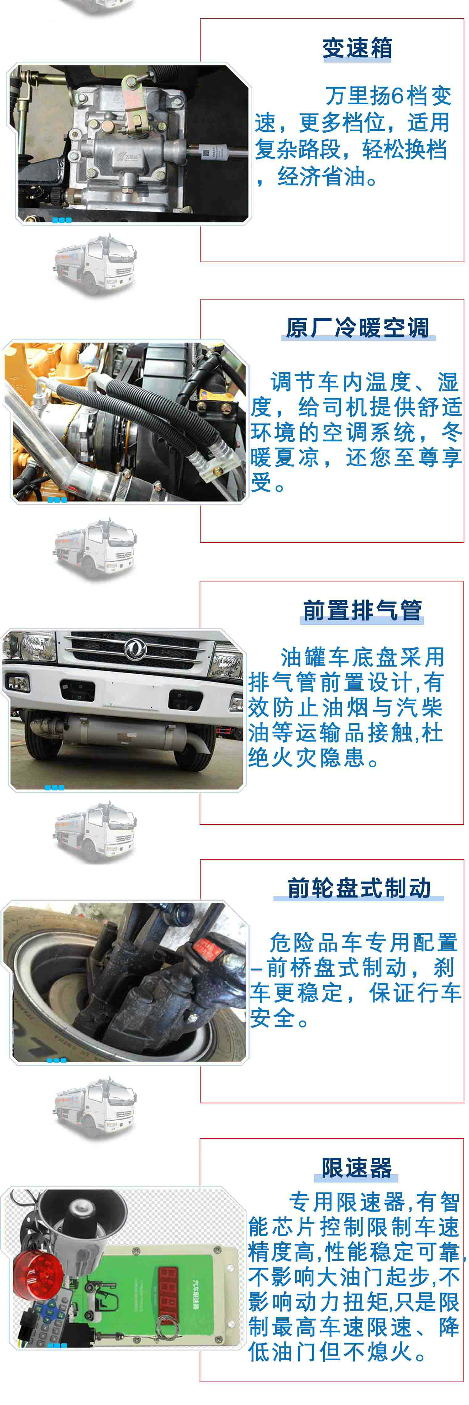 其他 | 1、該車適用于危險品運輸,運輸介質為柴油,煤油,汽油;密度分別為830,800,750千克/立方米;類項號:3;罐體有效容積:8.2立方米。罐體外形尺寸(長×長軸×短軸)(mm):4800×1950×1300。2、防護材料:Q235A碳鋼,連接方式:左右側面及后下部防護均采用焊接連接,后部防護斷面尺寸(mm):110×50,后部防護離地高度(mm):390。3、該車可裝配加油裝置型號及生產企業(yè):BL1111Z/珠海市貝林加油設備有限公司中山分公司,HS1812B/托肯恒山科技(廣州)有限公司,SKES-1112/上海伯萊機械有限公司,SK20QF-111A,SK20QF-222A/鄭州三金石油設備制造有限公司,CS20D1110F/正星科技有限公司, JSK-70B1121CZ/穩(wěn)恩佳力佳(北京)石油化工設備有限公司,ZH6444/佛山市眾澤機電科技有限公司。4、僅采用底盤子午線輪胎和帶ABS的底盤; 該車前輪安裝盤式制動器,前置排氣管,裝配限速裝置,限速80km/h。安裝帶有衛(wèi)星定位功能的行駛記錄儀。ABS系統(tǒng)生產廠家及型號:襄陽東風隆誠機械有限責任公司,ABS/ASR-24V-4S/4M。5、隨底盤選裝前面罩,前保險杠,前組合燈具;可選裝不帶走臺,工具箱位置可選擇。 |