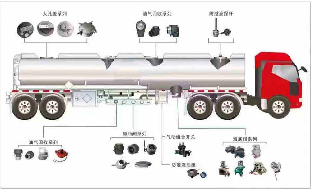 油罐車:又稱流動(dòng)加油車、電腦稅控加油車、引油槽車、裝油車、運(yùn)油車、拉油車、石油運(yùn)輸車、食用油運(yùn)輸車,主要用作石油的衍生品(汽油、柴油、原油、潤(rùn)滑油及煤焦油等油品)的運(yùn)輸和儲(chǔ)藏。根據(jù)不同的用途和使用環(huán)境有多種加油或運(yùn)油功能,具有吸油、泵油,多種油分裝、分放等功能。運(yùn)油車專用部分由罐體、取力器、傳動(dòng)軸、齒輪油泵、管網(wǎng)系統(tǒng)等部件組成。 管網(wǎng)系統(tǒng)由油泵、三通四位球閥、雙向球閥、濾網(wǎng)、管道組成。