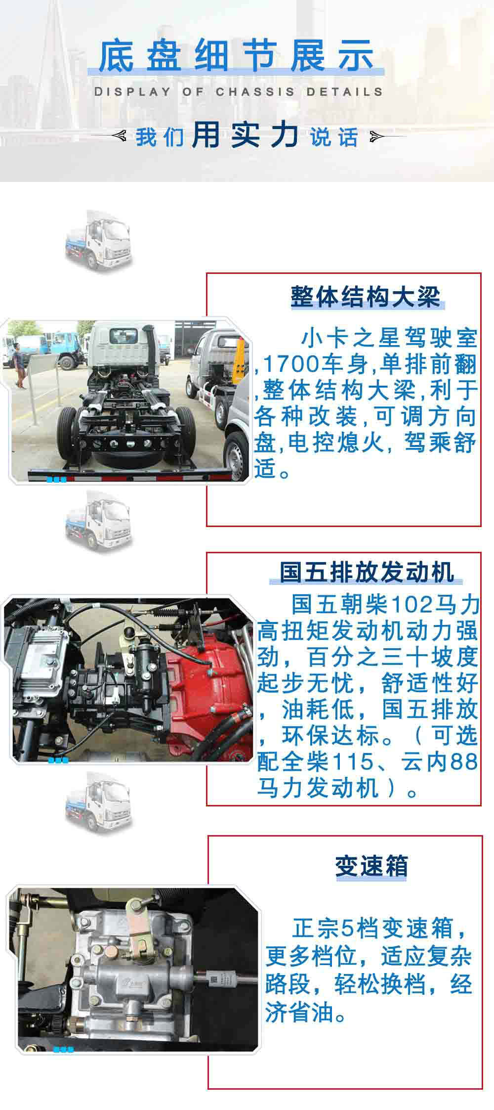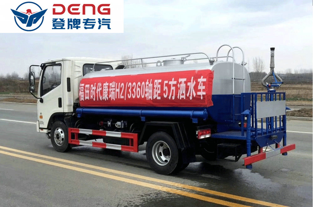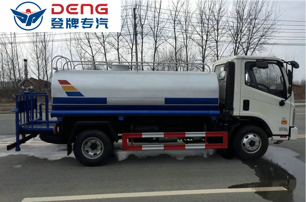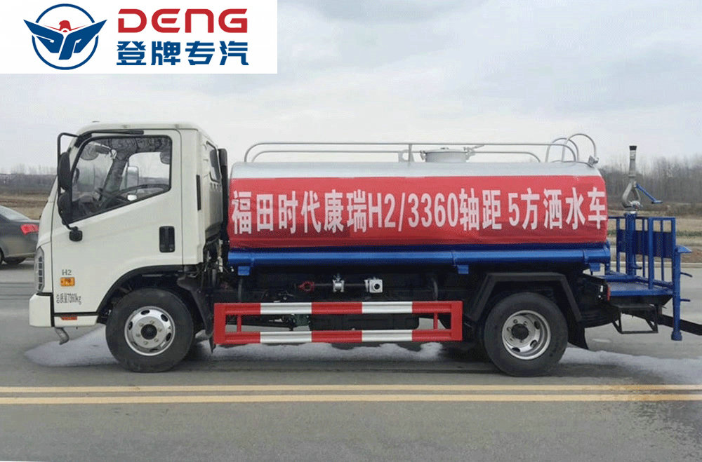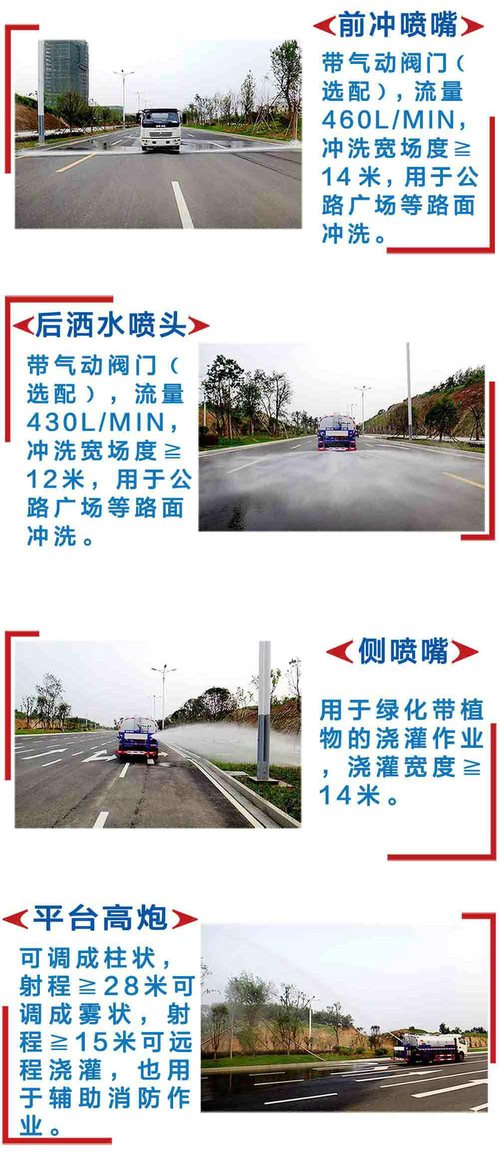 上裝配置:罐體有效容積5立方,罐體采用國標(biāo)Q235碳鋼,罐體厚度3mm,自吸自排水泵,帶前沖裝置,后灑裝置,左右側(cè)噴裝置,尾部帶有安全操作平臺,帶消防接口,自流口,兩根輸水管,尾部綠化高炮,綠化高炮可調(diào)節(jié)直沖,大雨,中雨,毛毛雨霧,可以連續(xù)調(diào)節(jié),360度旋轉(zhuǎn);