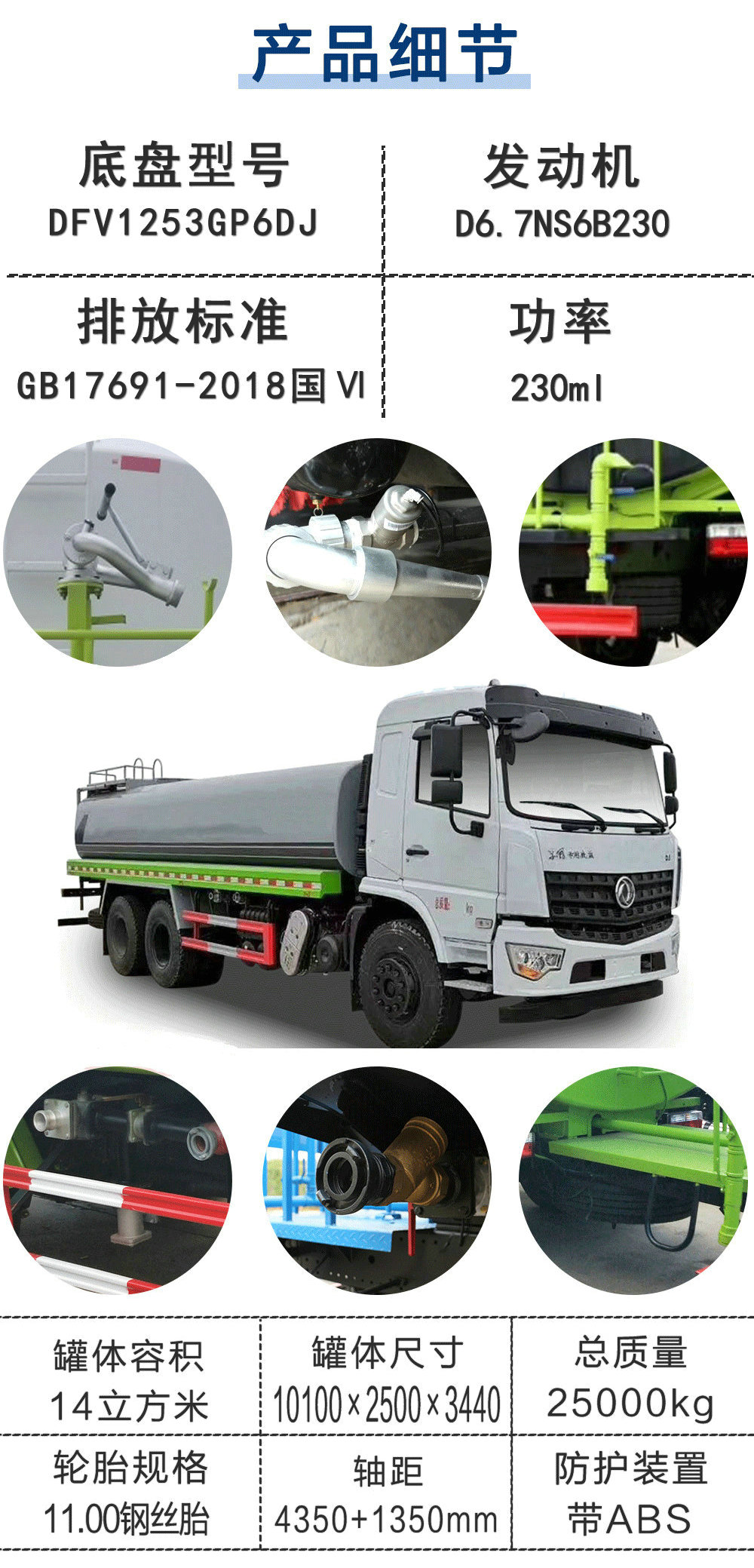 其他 | 1、該車主要用于園林綠化,主要專用裝置為水罐和噴灑總成。運輸介質(zhì):水.密度:1000千克/立方米,罐體有效容積:14.74立方米,罐體外形尺寸(長×長軸×短軸)(mm): 6000X2300X1450。僅選用軸距: 4350+1350mm 2、側(cè)/后防護材料為Q235B,側(cè)防護螺栓連接,后防護焊接,截面尺寸(mm):150×50,離地高(mm):480。3、隨底盤選裝駕駛室,選裝后部LED箭頭指示燈,選裝方形裝卸軟管箱,選裝后弧形噴霧。ABS型號/生產(chǎn)廠家:3631010-C2000/東科克諾爾商用車制動系統(tǒng)(十堰)有限公司。 |