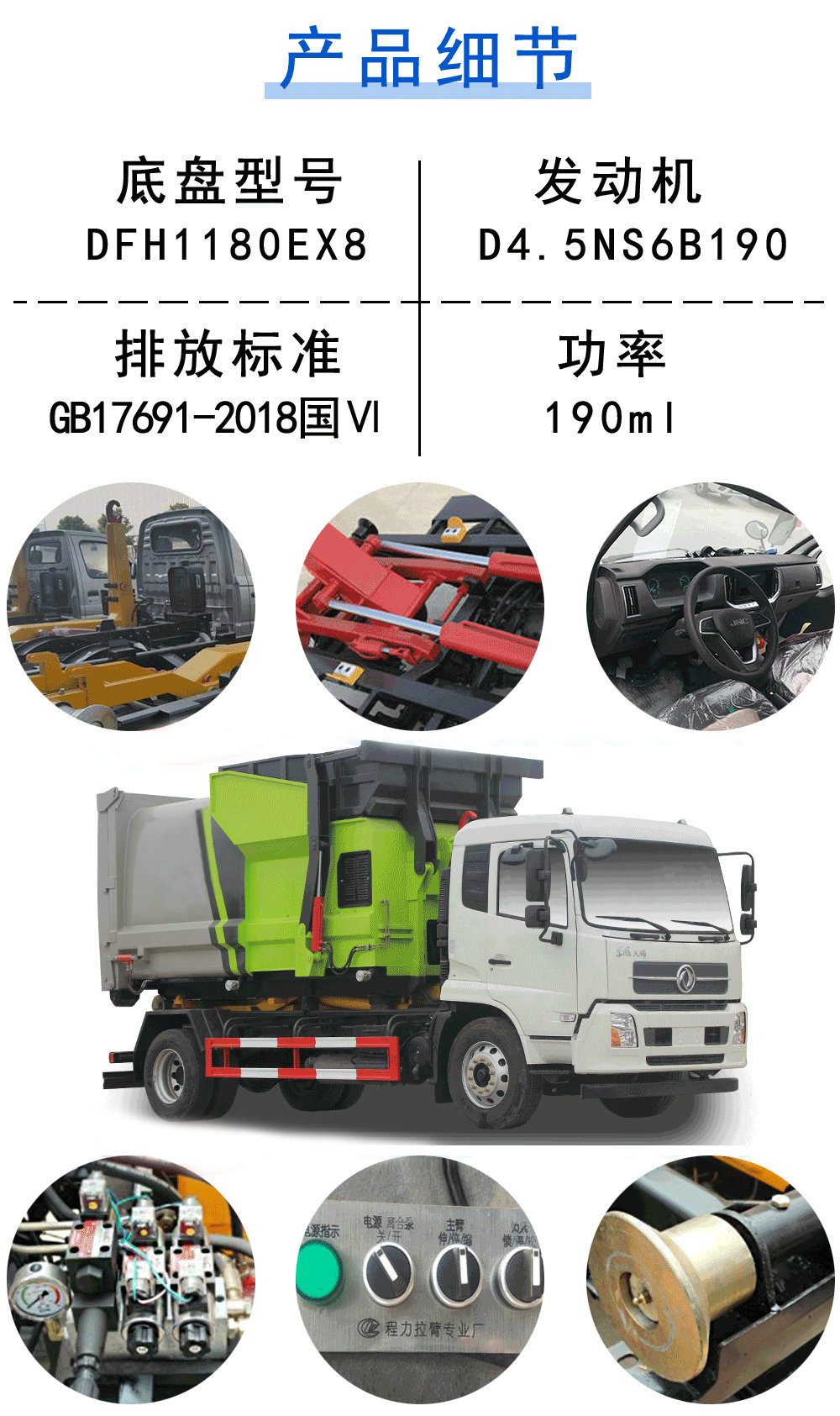 | 其他 | 1、該車主要用于垃圾轉(zhuǎn)運(yùn),專用裝置為勾臂;2、隨底盤選裝駕駛室;3、該車選用4500mm,4700mm軸距底盤改裝,整車外形長(zhǎng)/前懸/軸距/后懸對(duì)應(yīng)關(guān)系(mm):7300/1400(1430)/4500/1400(1370),7500/1400(1430)/4700/1400(1370);整備質(zhì)量與額定載質(zhì)量對(duì)應(yīng)關(guān)系為:7490kg/10380kg(2人)/10315kg(3人),7580kg/10290kg(2人)/10225kg(3人);4、防護(hù)材料:Q235B碳鋼,連接方式:左右側(cè)面防護(hù)與副梁均采用焊接連接,后下部防護(hù)與車架采用焊接連接,后部防護(hù)斷面尺寸(mm):120×60,后部防護(hù)離地高度(mm):440;5、ABS型號(hào)/生產(chǎn)廠家:3631010-C2000/東科克諾爾商用車制動(dòng)系統(tǒng)(十堰)有限公司,ABS 8/東科克諾爾商用車制動(dòng)系統(tǒng)(十堰)有限公司, 4460046450/威伯科汽車控制系統(tǒng)(中國(guó))有限公司;6、安裝帶衛(wèi)星定位功能的行駛記錄儀,發(fā)動(dòng)機(jī)型號(hào)/油耗值對(duì)應(yīng)關(guān)系為:D4.5NS6B190/24.4,D6.7NS6B230/23.7,DDi50E190-60/23.9,B6.2NS6B210/23.8,B6.2NS6B230/23.8. | ||