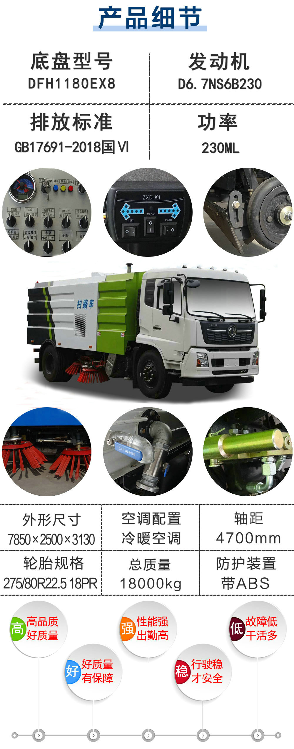 其他 | 此車為道路清掃專用車輛,專用裝置為掃刷.防護材料:Q235A碳鋼,連接方式:左右側(cè)面防護為掃刷,離地高為(mm):180,后下部防護與車架采用焊接連接,后下部防護尺寸:50×120(mm),離地面高度470mm.隨底盤選裝駕駛室.ABS型號/生產(chǎn)廠家:3631010-C2000/東科克諾爾商用車制動系統(tǒng)(十堰)有限公司,ABS 8/東科克諾爾商用車制動系統(tǒng)(十堰)有限公司, 4460046450/威伯科汽車控制系統(tǒng)(中國)有限公司.此整車長/前懸/軸距/后懸對應關(guān)系為(mm):7930/1430/4700/1800,7930/1400/4700/1830,7730/1430/4500/1800,7430/1430/4200/1800,7180/1430/3950/1800,7030/1430/3800/1800.隨底盤選裝駕駛室. |
