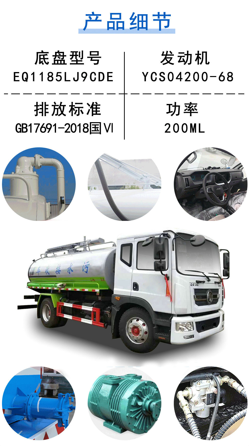 其他 | 1,罐體有效容積:12.8立方米,罐體外形尺寸(長×長軸×短軸)(mm):4700×2250×1550;整車長度/軸距的對應(yīng)關(guān)系為(mm):8000/3950,8550/4500,8750/4700,9050/5000,9350/5300,9650/5600;2,側(cè)防護(hù)及后下部防護(hù)裝置均采用Q235A材質(zhì),側(cè)防護(hù)采用焊接連接,后下部防護(hù)采用螺栓連接,后下部防護(hù)尺寸:150×50(mm),離地面高度450mm.3,ABS系統(tǒng)生產(chǎn)廠家,型號 :焦作博瑞克控制技術(shù)有限公司,J ABS.此車為吸糞專用作業(yè)車,專用裝置為真空泵.隨底盤選裝駕駛室. |