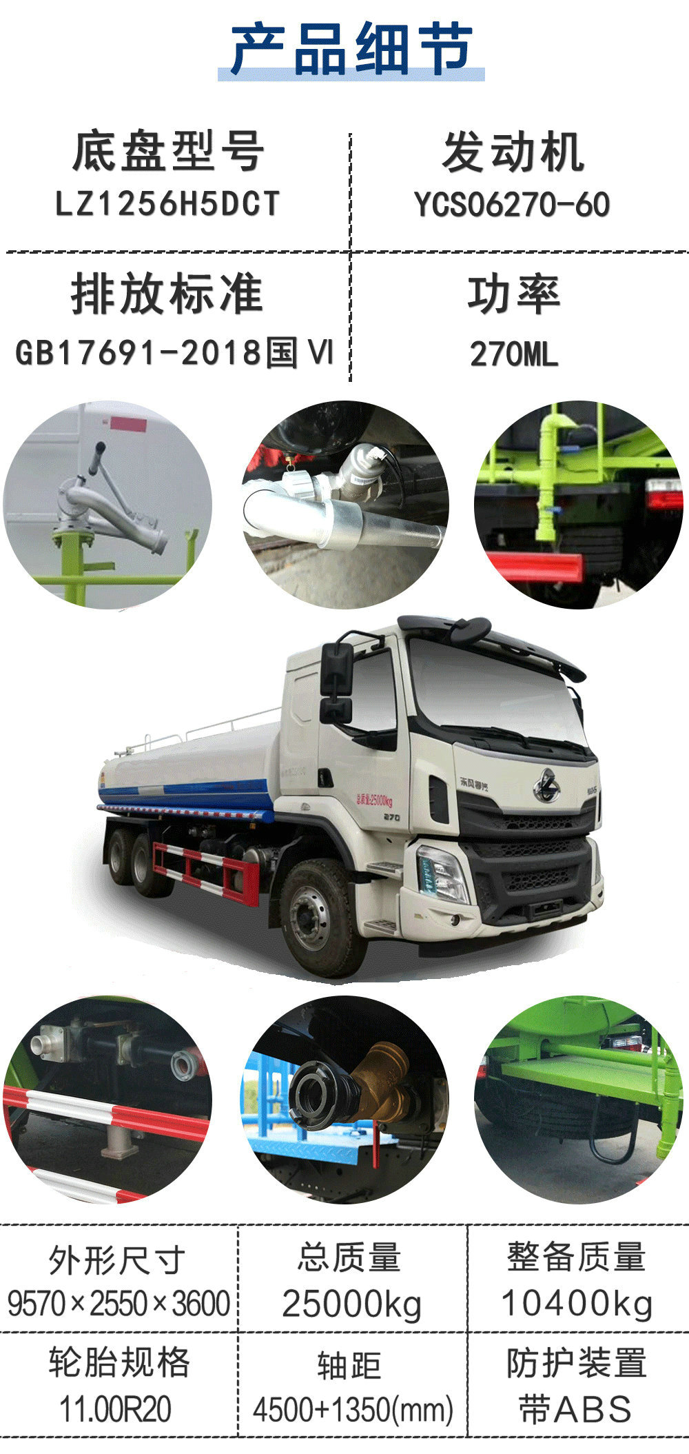 | 其他 | 罐體有效容積(立方米):15.1.罐體外形(mm): 罐體外形尺寸(6000×2350×1500)(mm);運(yùn)輸介質(zhì):水,密度:1000kg/立方米.選裝保險(xiǎn)杠、翼子板,選裝后視鏡,選裝車門下飾板,選裝臥鋪側(cè)窗,選裝綠玻璃,選裝高頂駕駛室,選裝導(dǎo)流罩.防護(hù)材料采用Q235A鋼板,連接方式為焊接.后防護(hù)截面尺寸120×80mm,下邊緣離地高度480mm.安裝具有衛(wèi)星定位功能的行駛記錄儀.ABS型號/企業(yè):ABS-E 4S/4M/威伯科汽車控制系統(tǒng)(中國)有限公司.YCS06270-60發(fā)動機(jī)對應(yīng)油耗值為32.1L/100km. | ||
