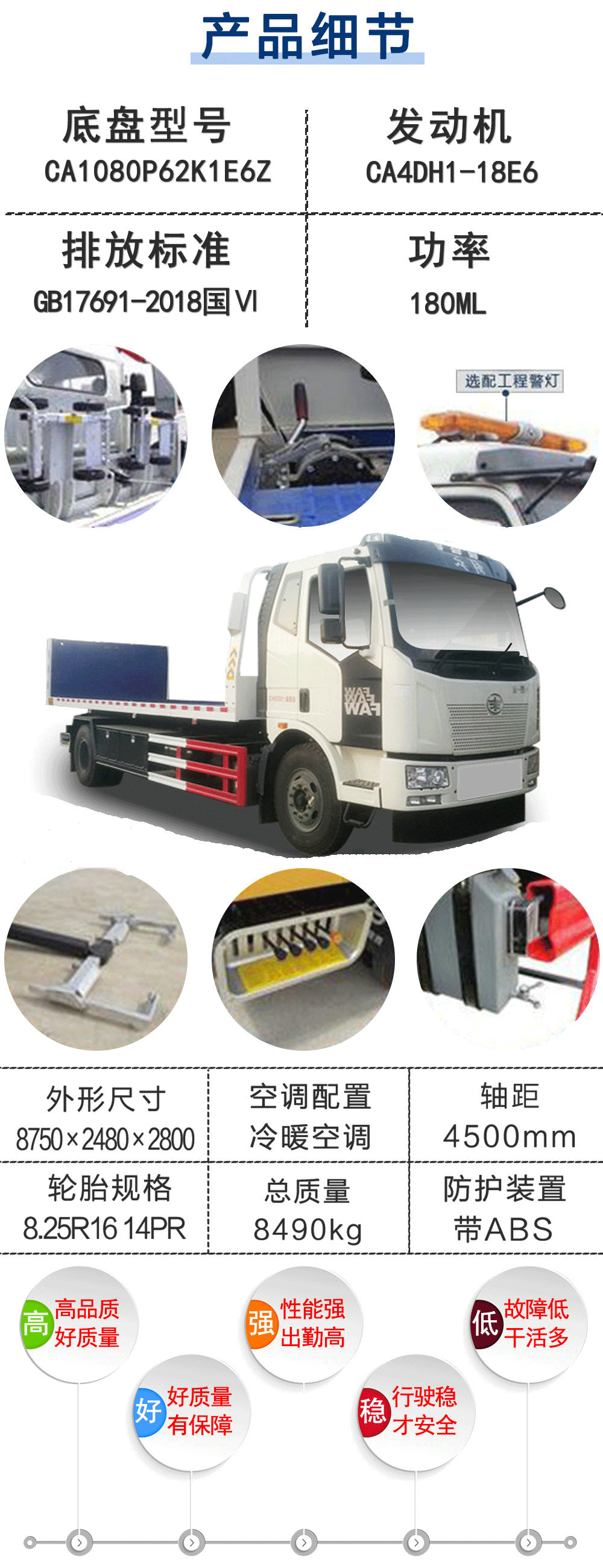 其他 | 此車為道路清障專用作業(yè)車.托舉質(zhì)量為:1395kg.防護(hù)材料:Q235A,連接方式:左右側(cè)面防護(hù)與副梁采用焊接連接;后部為專用專用裝置為托臂,代替后防,離地高為(mm):350;ABS防抱死制動系統(tǒng)生產(chǎn)廠家:長春瑞立科密汽車電子有限公司,型號:CM4XL.隨底盤選裝駕駛室. |