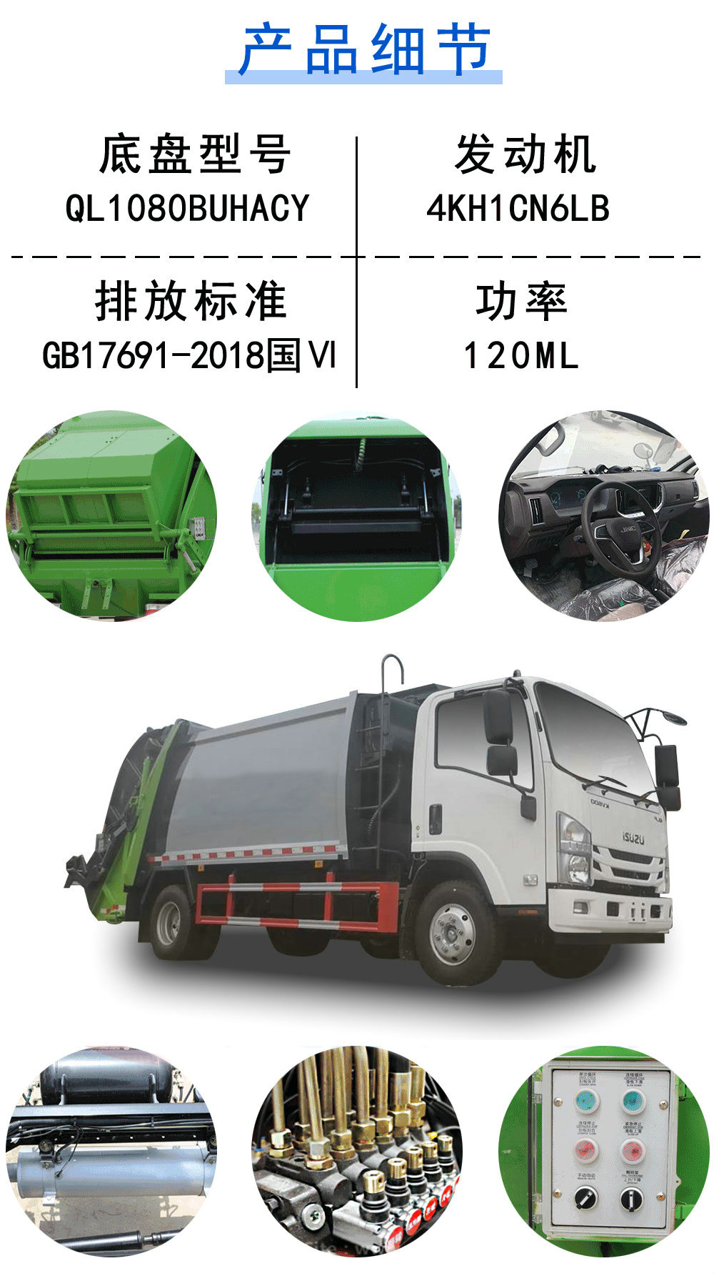 其他 | 1.該車(chē)具有三種配置:A后提桶機(jī)構(gòu)1狀態(tài),B后提桶機(jī)構(gòu)2狀態(tài),C后高裝填體配后提桶機(jī)構(gòu)2狀態(tài);2.配置A時(shí)長(zhǎng)6895mm,后伸610mm,整備質(zhì)量5540kg,額定載質(zhì)量2545kg;配置B時(shí)長(zhǎng)7130mm,后伸845mm,整備質(zhì)量5640kg,額定載質(zhì)量2445kg;配置C時(shí)長(zhǎng)7130mm,后伸845mm,整備質(zhì)量5790kg,額定載質(zhì)量2295kg;3.該車(chē)尾部提桶機(jī)構(gòu)1可選裝一種橡膠擋塊;該車(chē)并可選裝一種側(cè)裙邊結(jié)構(gòu),選裝側(cè)裙邊結(jié)構(gòu)時(shí),車(chē)輛側(cè)部防護(hù)為側(cè)裙邊車(chē)身替代;4.該車(chē)隨底盤(pán)選裝制動(dòng)系統(tǒng),油制動(dòng)對(duì)應(yīng)ABS及其控制器型號(hào)為:APG3550500A,生產(chǎn)廠家為:浙江亞太機(jī)電股份有限公司,僅與4KH1CN6LB型發(fā)動(dòng)機(jī)匹配;氣制動(dòng)對(duì)應(yīng)ABS及其控制器型號(hào)為:CM4XL-4S/4M,生產(chǎn)廠家為:廣州瑞立科密汽車(chē)電子股份有限公司;5.發(fā)動(dòng)機(jī)4KH1CN6LB,4KH1CN6HB分別對(duì)應(yīng)油耗值為15.9 L/100km.15.9 L/100km;6.該車(chē)隨底盤(pán)選裝后視鏡,輪眉,標(biāo)牌;7.側(cè)防材料鋁合金,螺栓連接.后防護(hù)由車(chē)輛后部結(jié)構(gòu)代替,離地高320mm.該車(chē)裝備有垃圾箱體,液壓裝置及垃圾裝填器,用于將垃圾自行壓實(shí)裝入,轉(zhuǎn)運(yùn)和卸料功能. |