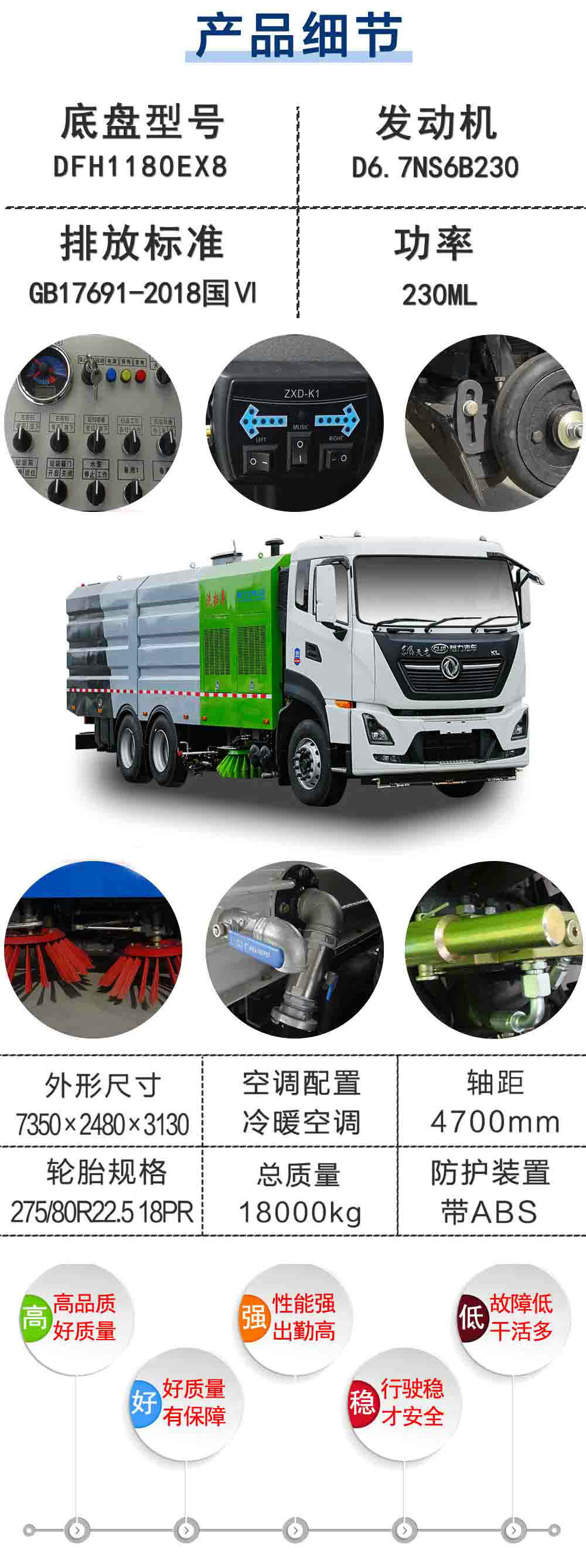 其他 | 此車為道路洗掃專用車輛,專用裝置為掃刷.防護材料:Q235A碳鋼,連接方式:左右側面防護為掃刷,離地高為(mm):200,后下部防護與車架采用焊接連接,后下部防護尺寸:50×240(mm),離地面高度360mm.隨底盤選裝駕駛室.ABS型號/生產(chǎn)廠家:3631010-C2000/東科克諾爾商用車制動系統(tǒng)(十堰)有限公司,ABS 8/東科克諾爾商用車制動系統(tǒng)(十堰)有限公司, 4460046450/威伯科汽車控制系統(tǒng)(中國)有限公司.此整車長/前懸/軸距/后懸對應關系為(mm);9350/1400/5800/2150,,8850/1400/5300/2150,8550/1400/5000/2150,8250/1400/4700/2150,8050/1400/4500/2150,7750/1400/4200/2150,7500/1400/3950/2150,7350/1400/3800/2150,9350/1430/5800/2120,8850/1430/5300/2120,8550/1400/5000/2120,8250/1400/4700/2120,8050/1430/4500/2120,7750/1430/4200/2120,7500/1430/3950/2120,7350/1430/3800/2120.選裝不同外形圖片. |