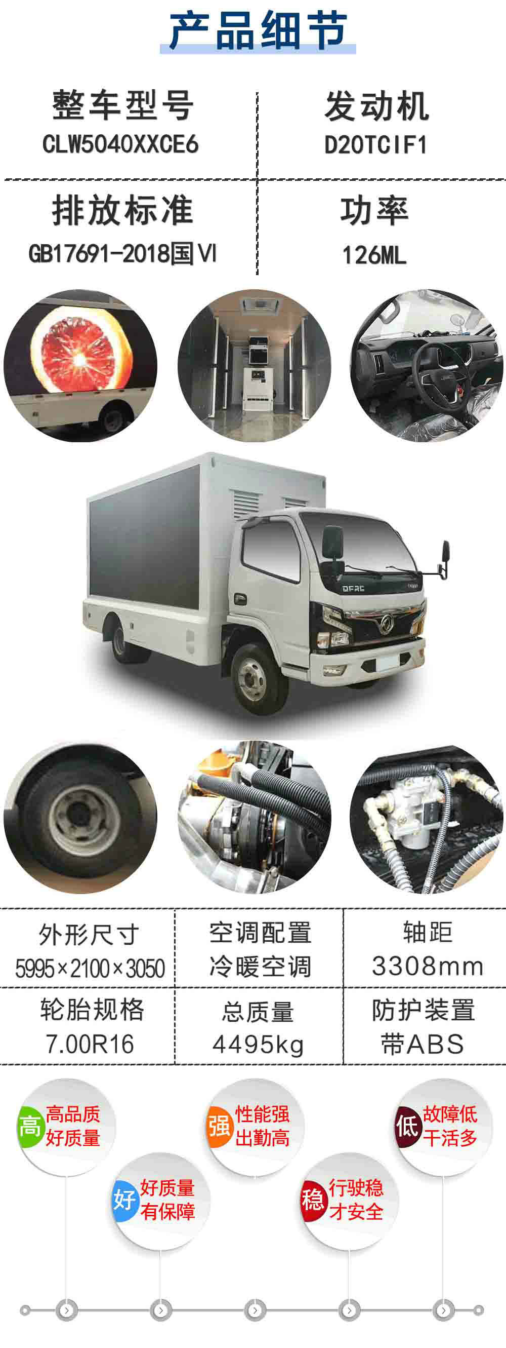 其他 | 該車(chē)是用于廣告宣傳的專(zhuān)用車(chē)輛.專(zhuān)用裝置為L(zhǎng)ED顯示屏.側(cè)后防護(hù)采用裙板結(jié)構(gòu)代替,后部裙板離地高為490mm.ABS型號(hào)/廠家:ABS/ASR-12V-4S/4M/襄陽(yáng)東風(fēng)隆誠(chéng)機(jī)械有限責(zé)任公司.隨底盤(pán)選裝駕駛室,兩側(cè)均可選裝:LED屏或側(cè)展,LED升降或者不帶升降屏,滾軸燈箱,條屏;選裝LED條屏,亦可選裝單開(kāi)或雙開(kāi)門(mén),或者封閉;選裝尾部踏板;后部可選裝LED屏或燈箱或后展,通風(fēng)口. |