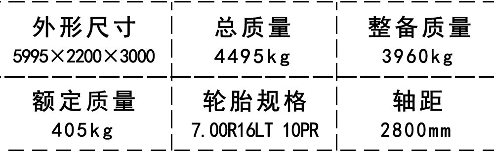 軸 距(mm) | 2800,3280,3360,3600 | 后輪距(mm) | 1555,1595,1695,1795 |