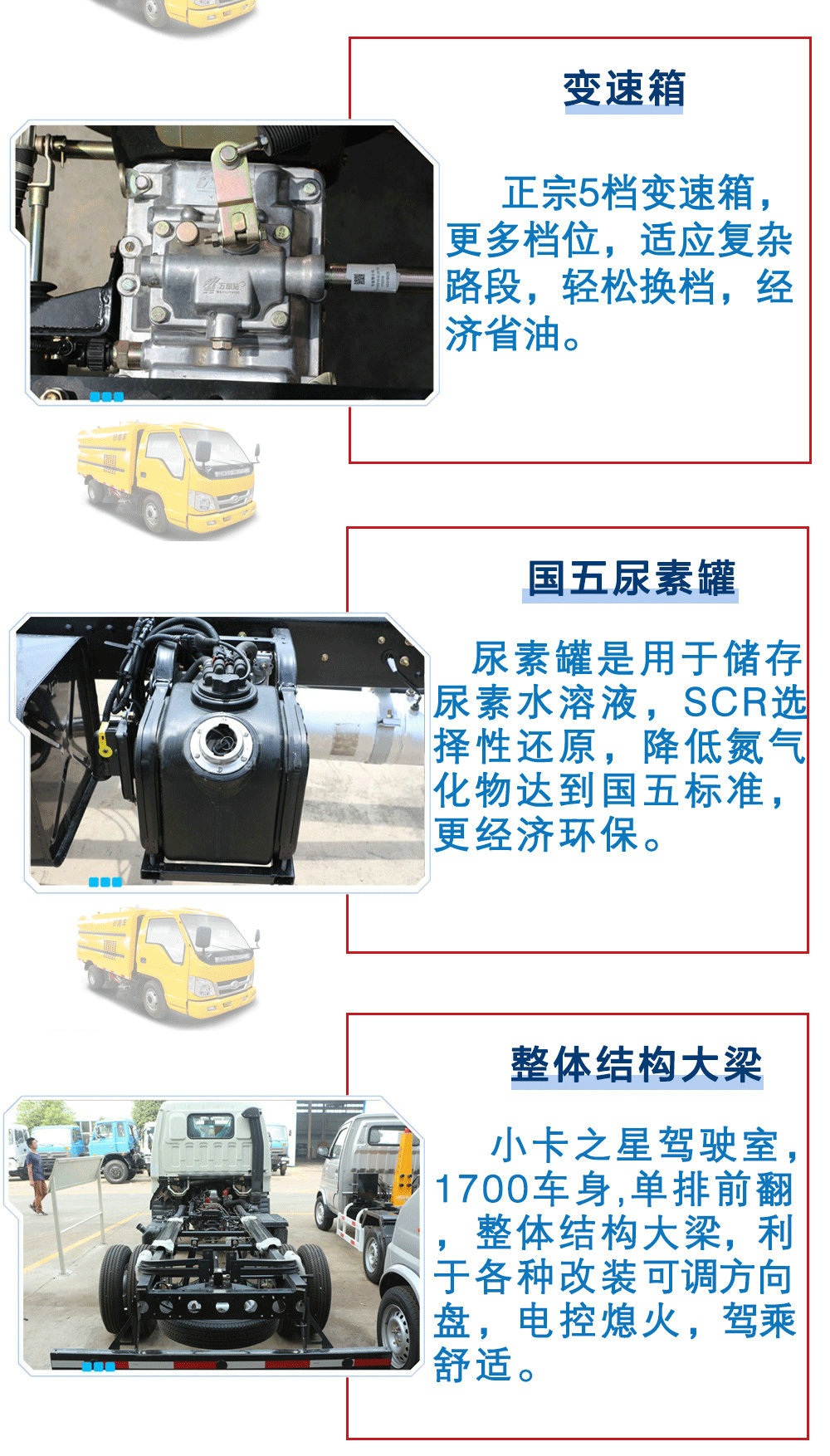 其他 | 防護(hù)材料:Q235A碳鋼,連接方式:左右側(cè)面防護(hù)豁免,后下部防護(hù)與大梁螺栓連接,后部防護(hù)斷面尺寸(mm):100×50,后部防護(hù)離地高度(mm):440。此車長(zhǎng)/軸距/前懸/后懸對(duì)應(yīng)關(guān)系為(mm):5560/2600/1115/1845;5210/2850/1115/1245.ABS系統(tǒng)控制方式為:雙參數(shù)控制,4S/4M.ABS系統(tǒng)控制器型號(hào)為:CM4Y.ABS系統(tǒng)控制器生產(chǎn)廠家為:廣州科密汽車電子控制技術(shù)股份有限公司.在不改變車輛性能及基本參數(shù)的情況下,擴(kuò)展不同的外形圖片,以提高市場(chǎng)競(jìng)爭(zhēng)力. |