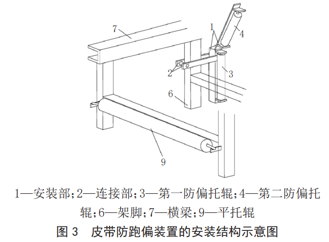 皮帶防跑偏裝置安裝如下頁圖3所示。皮帶機(jī)皮帶防跑偏裝置中,固定架的連接部用于將固定架的安裝部固定于皮帶機(jī)的H架上,而第一防偏托輥和第二防偏托輥均固定于安裝部上,第一防偏托輥可用于限制下皮帶的偏移,以防止下皮帶跑偏,第二防偏托輥可用于限制上皮帶的偏移,以防止上皮帶跑偏。
